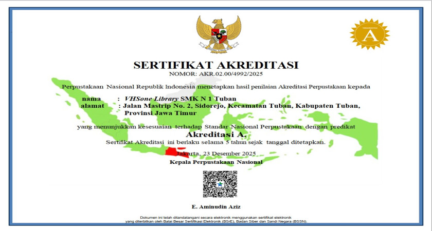 Dengan penuh rasa syukur kami menginformasikan bahwa hasil pengajuan akreditasi perpustakaan melalui aplikasi SiPaPi dari Perpustakaan Nasional Republik Indonesia menunjukkan bahwa Vhsone Library Perpustakaan SMK Negeri 1 Tuban telah memenuhi Standar Nasional Perpustakaan dengan predikat A.